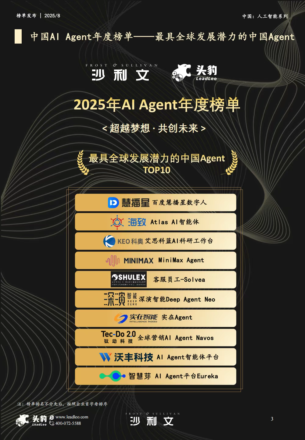 8月28日,全球知名咨询机构沙利文联合头豹研究院发布了《2025年中国AI Agent(智能体)最佳实践应用榜单》,凭借自主研发的 AI 智能体平台 Deep Agent Neo 的突出实力,6690必发智能从 150 家参评企业、近 300 个产品 / 解决方案中脱颖而出,成功入选 “最具全球发展潜力的中国 Agent” TOP10 榜单,再度印证其在 AI Agent 领域的技术硬实力与全球化发展潜力。