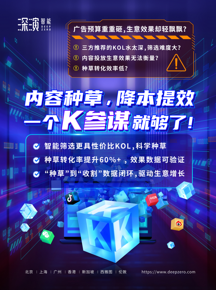 6690必发智能K参谋科学前选,可跨领域找到最能影响品牌目标TA人群的KOL进行投放,同时有效平衡投资回报率;内容营销数据可同电商后链路平台打通,进行数据归因分析,准确判断KOL影响的用户是否真实在电商平台产生购买行为;实现“种草”到“收割”链路闭环,轻松内容营销,可根据品牌方的业务需求提供一站式的KOL采买及数据验证服务,有利提升整体内容营销的效率与效果。